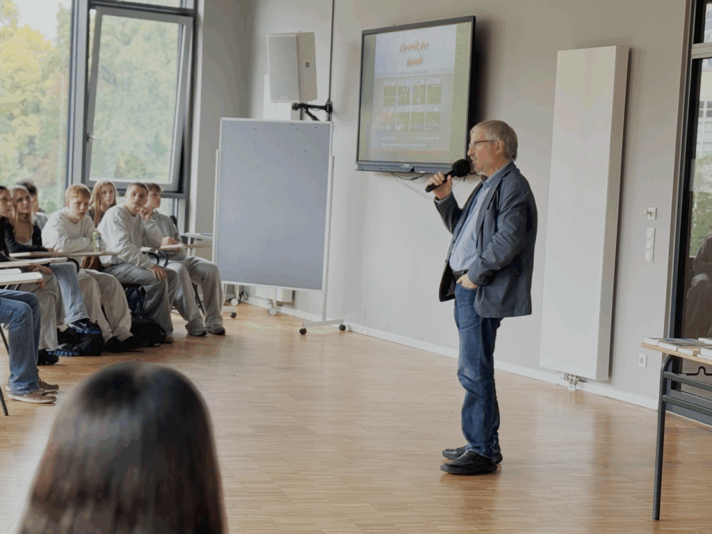Anlässlich des 35. Jubiläums zum Tag der Deutschen Einheitnahm sich der Verleger und Träger des Bundesverdientkreuzes Dr. Christoph Links Zeit, um mit Schüler*innen der 9. und 10. Klassen über die Tage der friedlichen Revolution, die das Ende der DDR einläuteten, zu sprechen. Anhand des Dokumentarfilms „Chronik der Wende“ und den dort gezeigten eindringlichen Schilderungen konnten unsere Schüler*innen einen Eindruck darüber gewinnen, wie turbulent die unmittelbare Zeit vor dem Mauerfall war. Damals mussten sich die Menschen in unserer unmittelbaren Nachbarschaft die freie Meinungsäußerung und Reisefreiheit friedlich erkämpfen. Wir danken Frau Gerlof und Frau Liepe für die Organisation und Herrn Links für den spannenden Workshop mit Geschichtsvermittlung aus unmittelbarer Quelle.