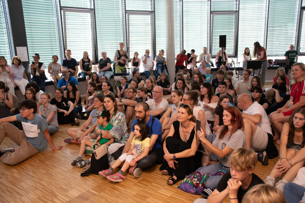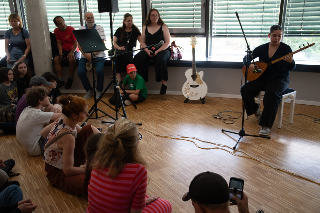 War das Wetter unter der Woche noch unbeständig, zeigte es sich am letzten Samstag des ausgehenden Schuljahres noch einmal von seiner besten Seite. Bei strahlendem Sonnenschein wurde das Fest auf dem Speicher-Hof mit einem fabelhaften Bühnenprogramm eröffnet. Nach der Mittagspause verlagerte sich das Geschehen zunehmend in die Arche, wo die Schulgemeinschaft die Ergebnisse der Lebenswelten-Kurse und der Gemeinschaftswoche präsentierte. Als Ort des inzwischen zum dritten Mal stattfindenden „Rock in der Arche“ wurde dieses Mal das Audimax ausgewählt. Nicht nur die Innentemperaturen sorgten dafür, dass das Publikum ins Schwitzen kam. Die Bandbreite reichte von instrumentalem Ethnosound auf der bağlama über gefühlvolle Balladen bis zum ohrenbetäubenden Hard Rock.
