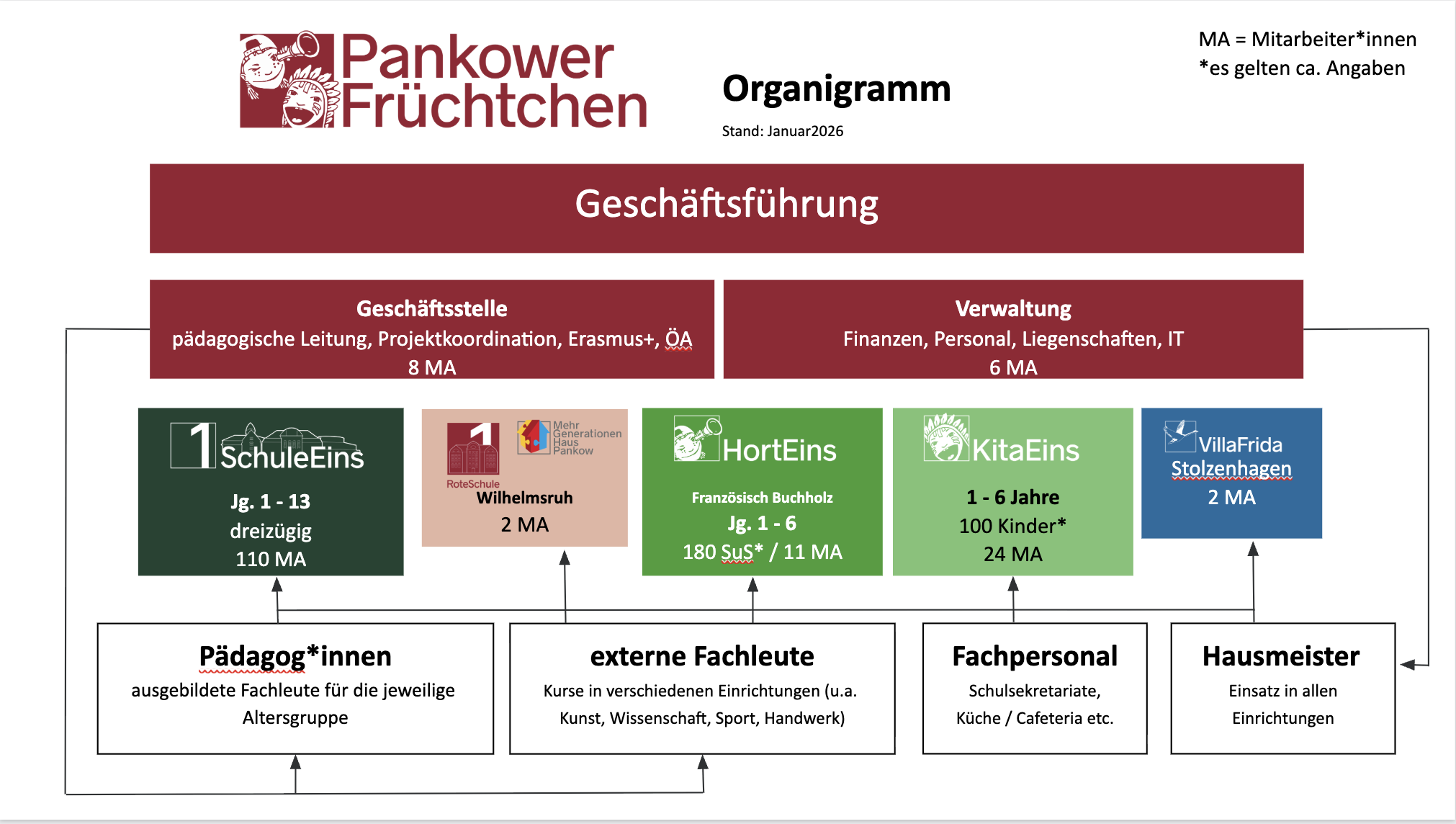 Im Jahr 2002 übernahmen die Pankower Früchtchen den ersten Schulhort in freier Trägerschaft in Berlin. Auch in der Jeanne-Barez-Grundschule (Haupthaus in Blankenfelde) in Französisch Buchholz ist ein Schulhort in die Trägerschaft der Pankower Früchtchen übergegangen.