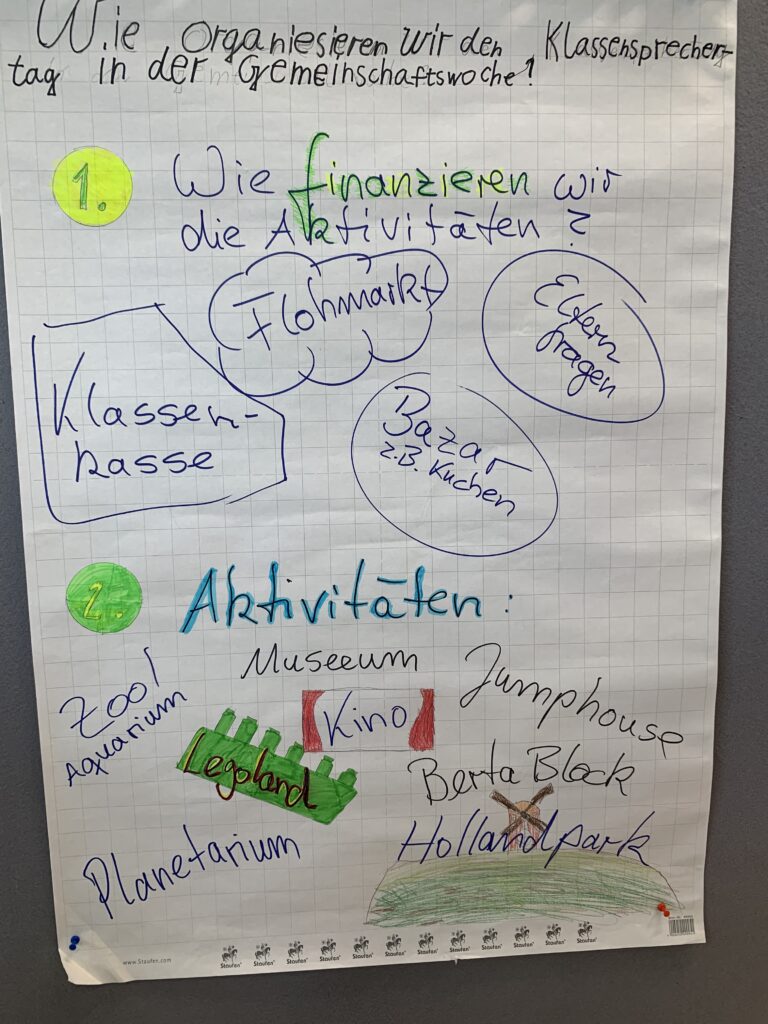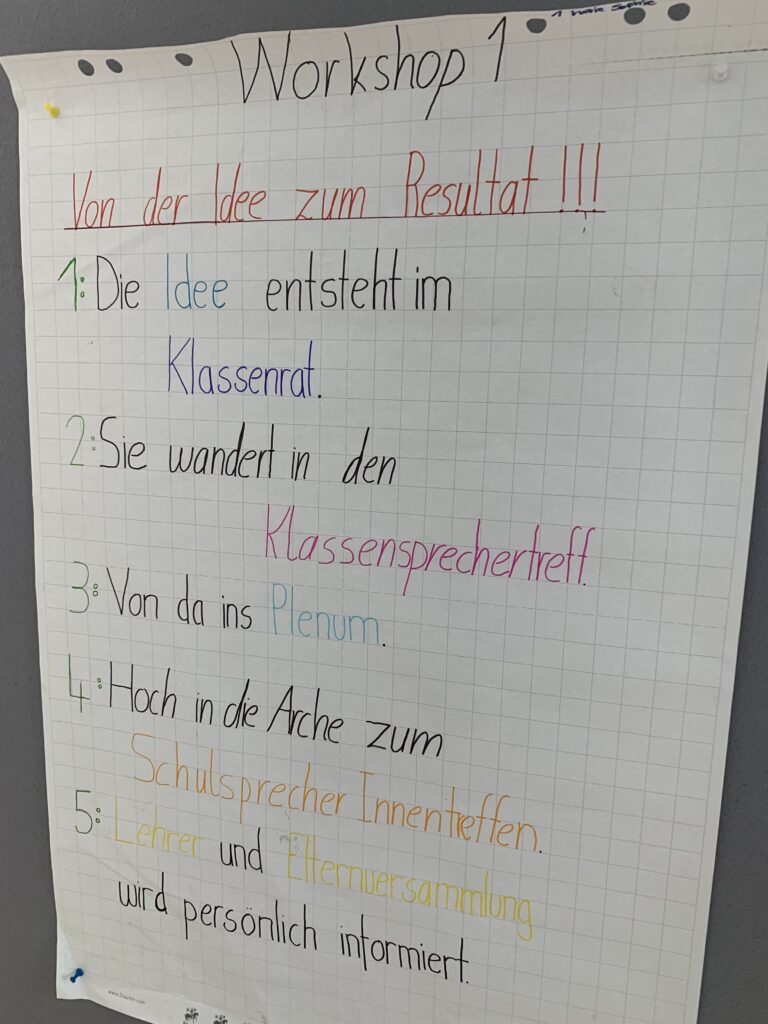 Am ersten Tag arbeiteten die Klassensprecher*innen in Workshops innerhalb ihrer Stufe, am zweiten gab es drei Themen/ Vorgaben und die Jugendlichen konnten sich selber aussuchen, in welchen Workshop sie gehen. Die Themen waren:
