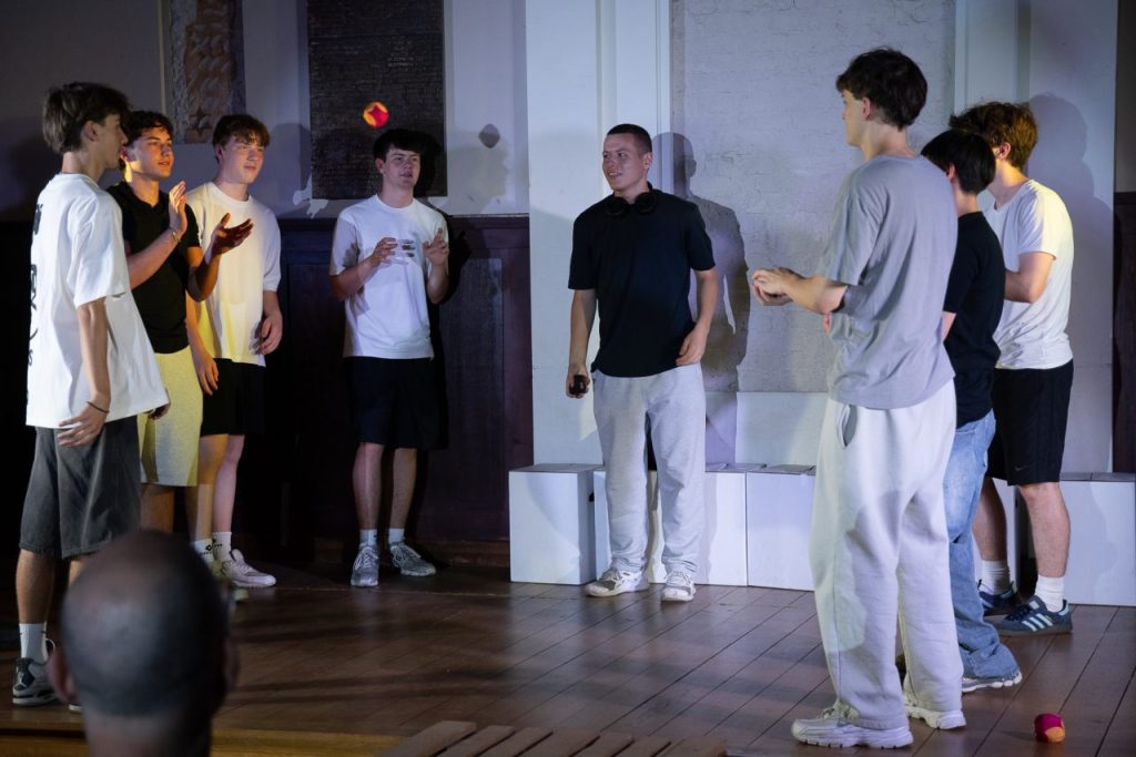 Das Stück Boys‘n‘Balls handelt von einer allseits bekannten Situation in der Schule: Ein ‚Neuer‘, zwei Sportler, eine Gruppe von Mobbern und die weiteren Schüler müssen in einer Klasse zusammenkommen.